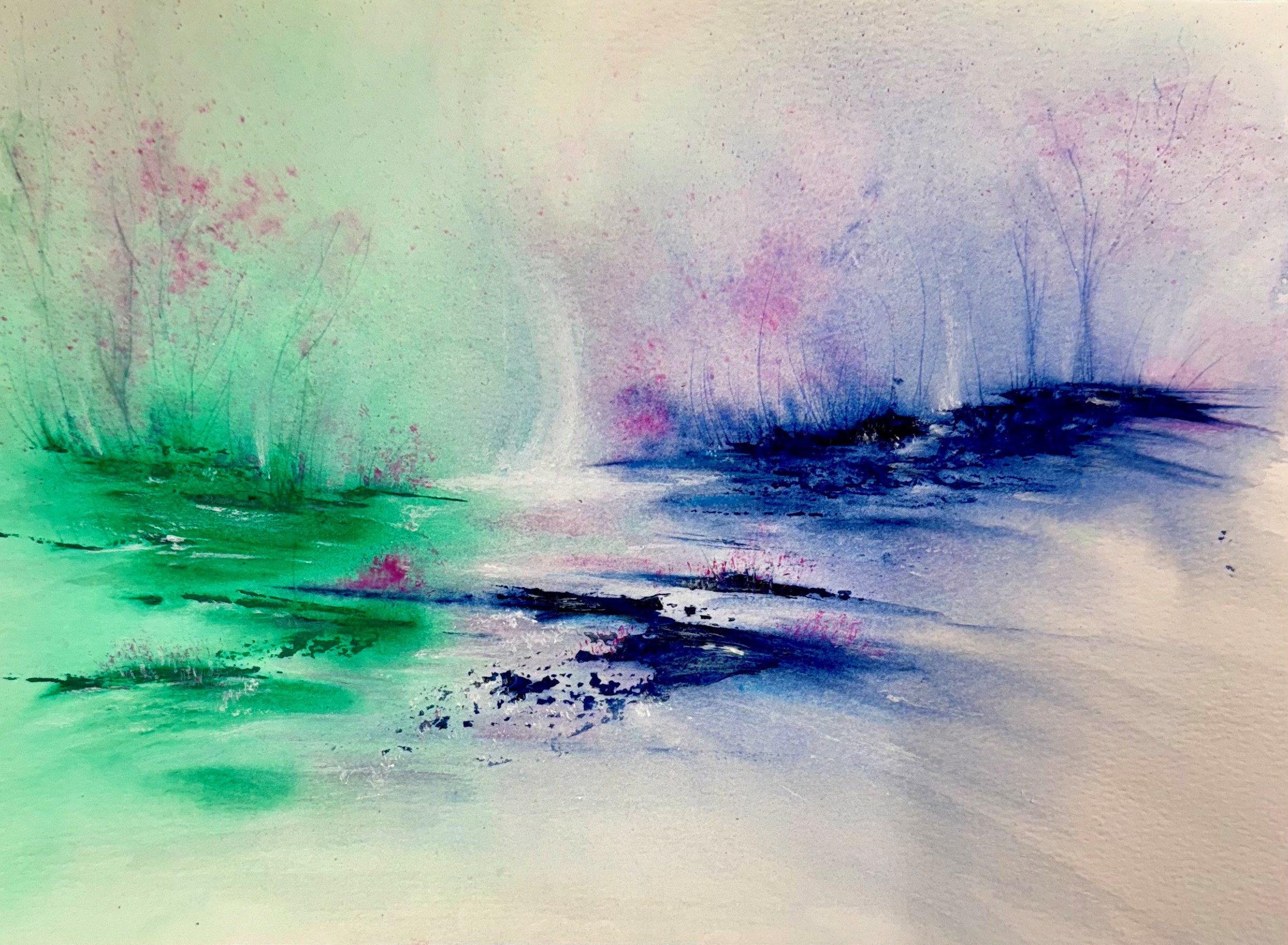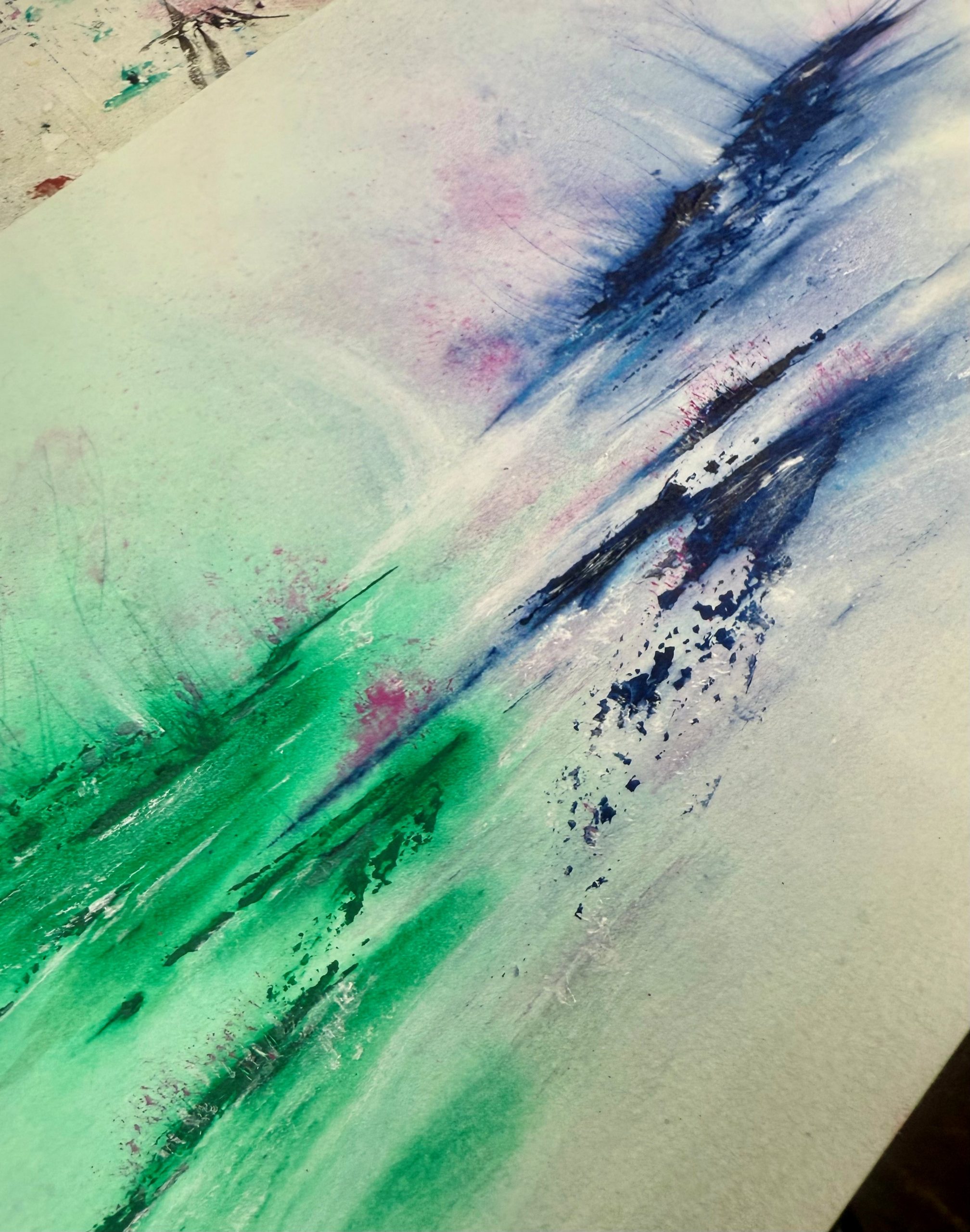 Distance is a quietly powerful and deeply atmospheric work, created through intuition rather than intention. Using just two colours—blue and green—the painting unfolds organically, with tone, flow, and movement guiding its evolution. Water plays a central role in the process, shaping the composition in ways that cannot be forced or predicted, allowing the piece to find its own balance and depth.