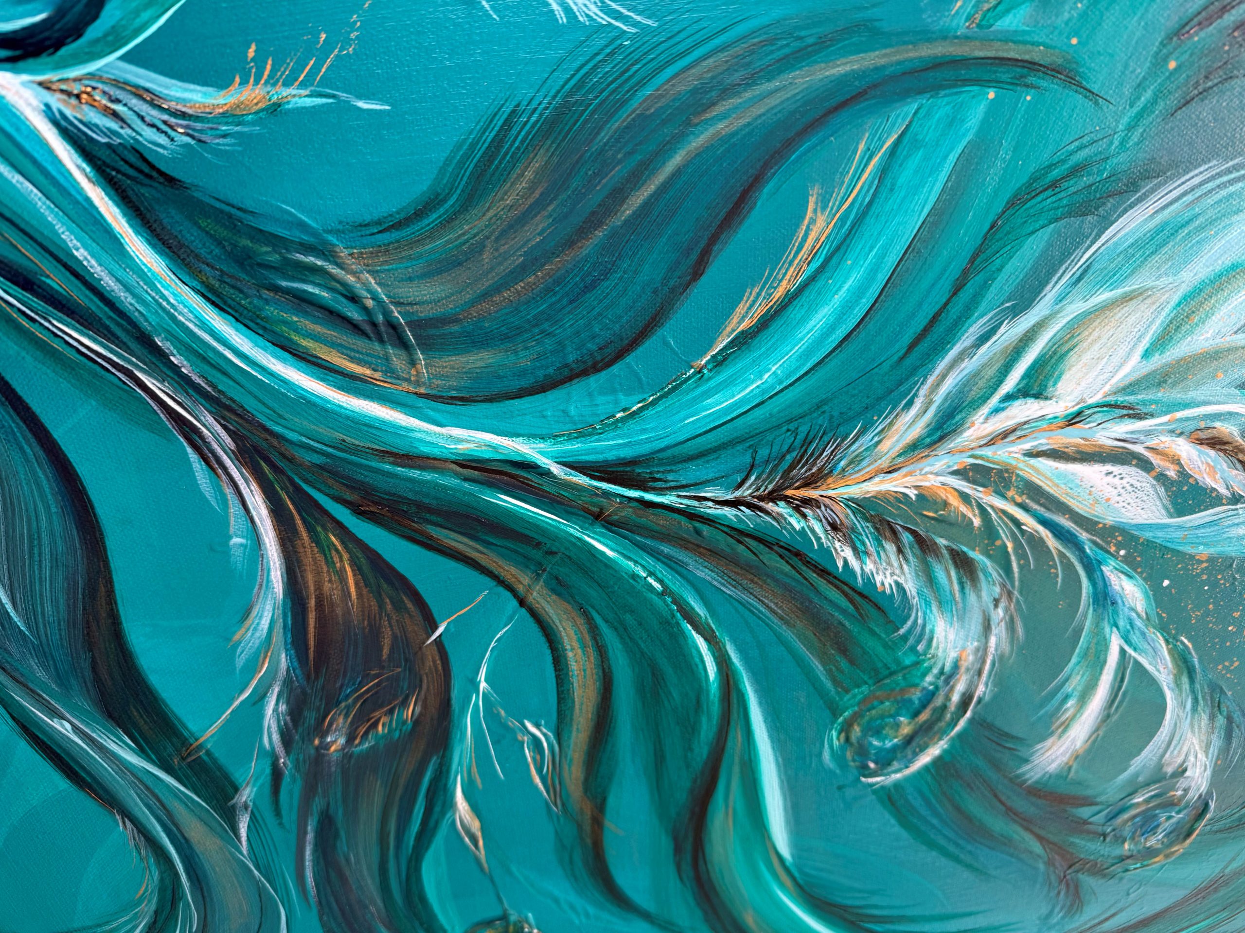 Painting this piece was a calming experience for me. Using one of my favourite brushes, I built the sense of movement across the canvas. The longer you look, the more reveals itself. The gold highlights lift the whole composition, making it shimmer and come alive.